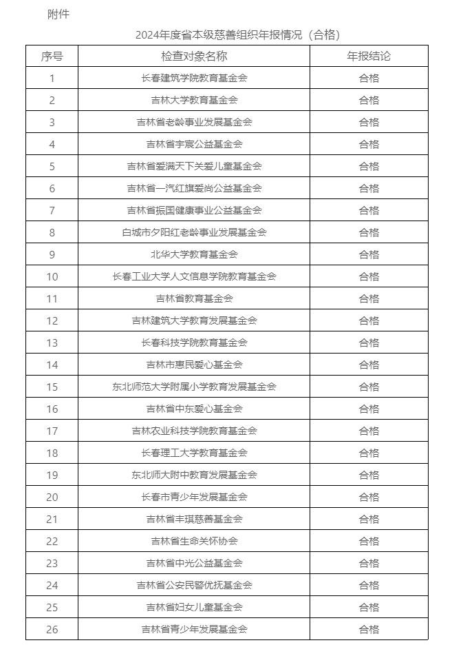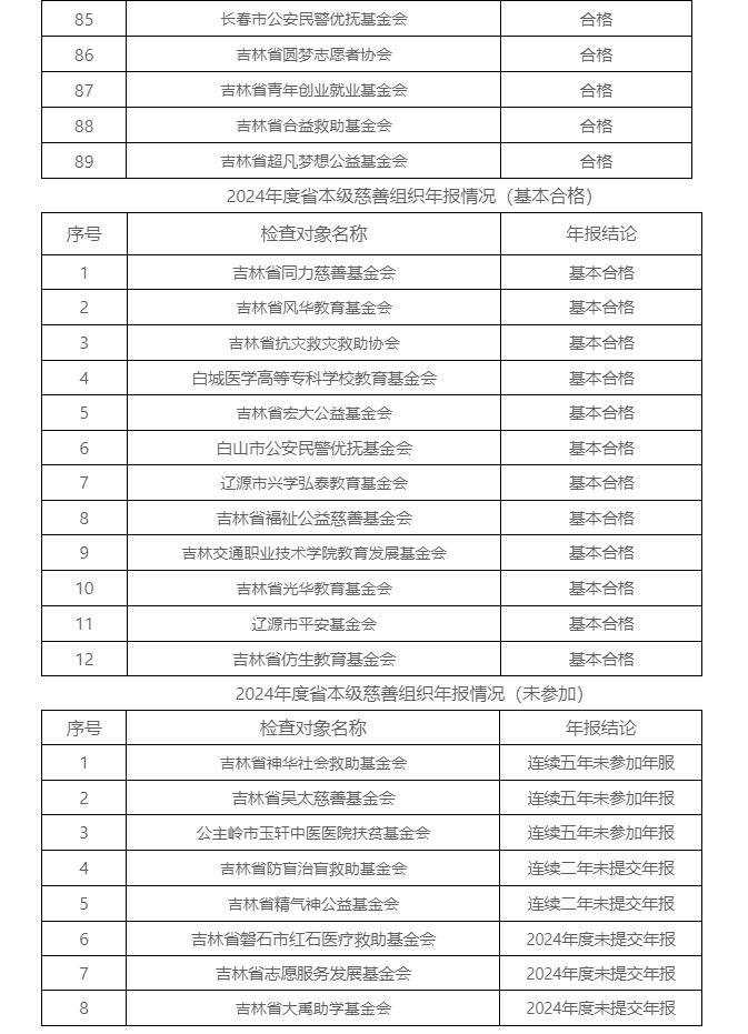 人民網長春6月9日電 近日,吉林省民政廳發布《關于公布2024年度省本級慈善組織年報情況的公告》,對全省109家慈善組織的年度運行情況進行了全面“體檢”,涵蓋教育、助老等多個領域。結果顯示,89家機構年報結論為“合格”;12家機構“基本合格”;另有8家機構或連續多年未提交年報,或未參加檢查。