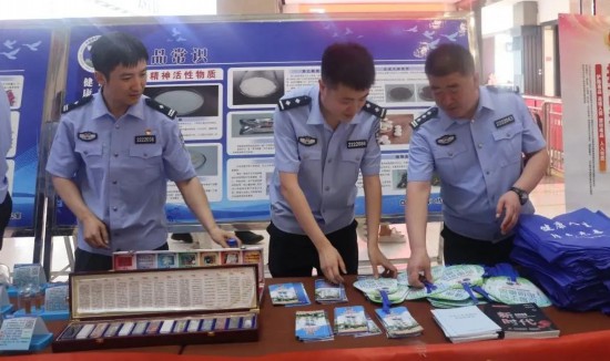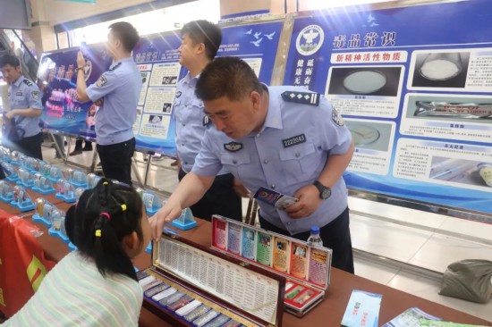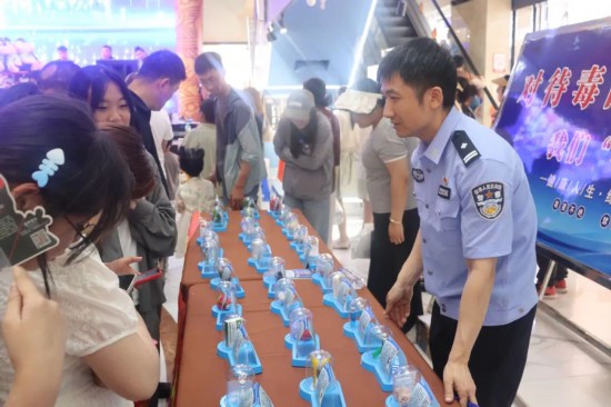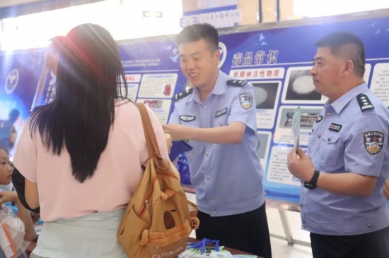 “原來這就是冰毒”“毒品原來有這么多種”“這么些種類毒品太可怕了”……伴隨著現場輕揚音樂,展臺前吸引了越來越多的市民朋友們駐足觀看。一位帶著孩子的年輕媽媽牽著女兒的手湊近展臺,眼神中滿是警惕:“警察同志,現在這些毒品偽裝得五花八門,我們做家長的該怎么教孩子識別啊?”民警立刻從展板上取下一張 “新型毒品偽裝圖鑒”,耐心解釋道:“您看,這種彩色小顆粒‘跳跳糖’、包裝精美的‘止咳水’,都可能是毒品。平時要多和孩子強調,來歷不明的東西一口都不能碰。”說著,還遞上一本圖文并茂的兒童版禁毒手冊,小女孩睜著大眼睛,認真翻看著手冊上的卡通禁毒故事。人群中,幾位白發蒼蒼的老人也擠到前排,其中一位拄著拐杖的大爺感慨:“現在的毒品比我們那時候狡猾多了!”民警趕忙扶住大爺,笑著回應:“大爺,您可得把今天學到的知識帶回去,給街坊鄰居都講講。有些不法分子專門騙老年人,把毒品偽裝成保健品,咱們得多留個心眼!”大爺聽后連連點頭,小心翼翼地把禁毒宣傳冊塞進上衣口袋。