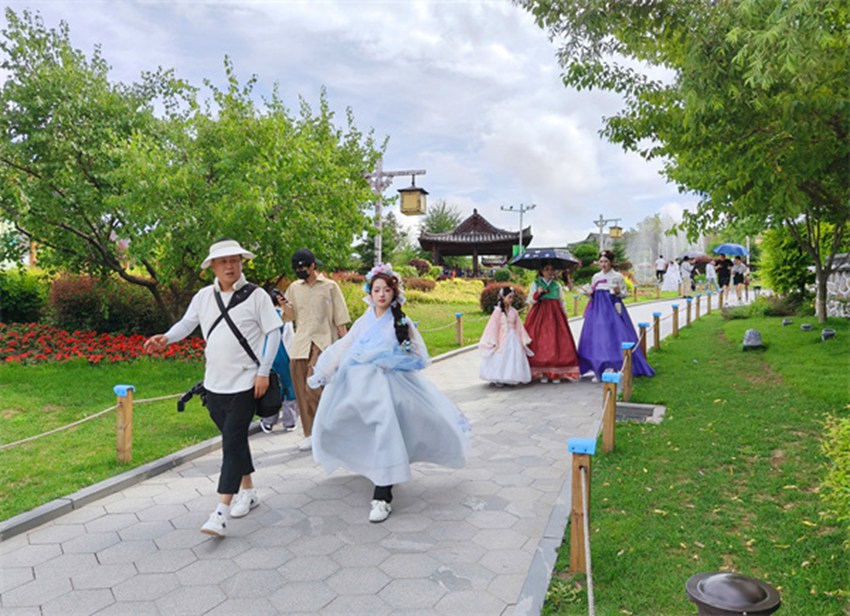 來自天南海北、不同民族的游客身著朝鮮族傳統服飾,在青瓦白墻的古建筑間打卡;穿梭于農家、漁家、匠戶等主題院落,沉浸式體驗朝鮮族傳統的生活場景;親手制作宮廷米糕、米酒,體驗傳統陶藝,感受非遺魅力;觀賞歌舞演藝與摔跤競技,暢玩秋千、跳板、投壺等傳統游戲……身著美麗的朝鮮族服飾、沉浸于此的廣州游客李亞芳和劉美林感慨道:“這里太美了,文化氛圍太濃厚了!我們既感受到中華文化的博大與魅力,也體會到了延邊人民的淳樸與熱情!”