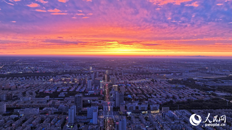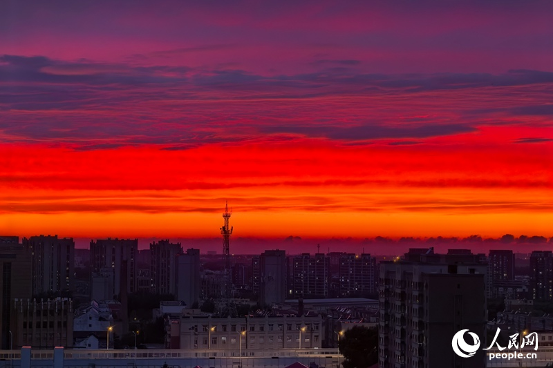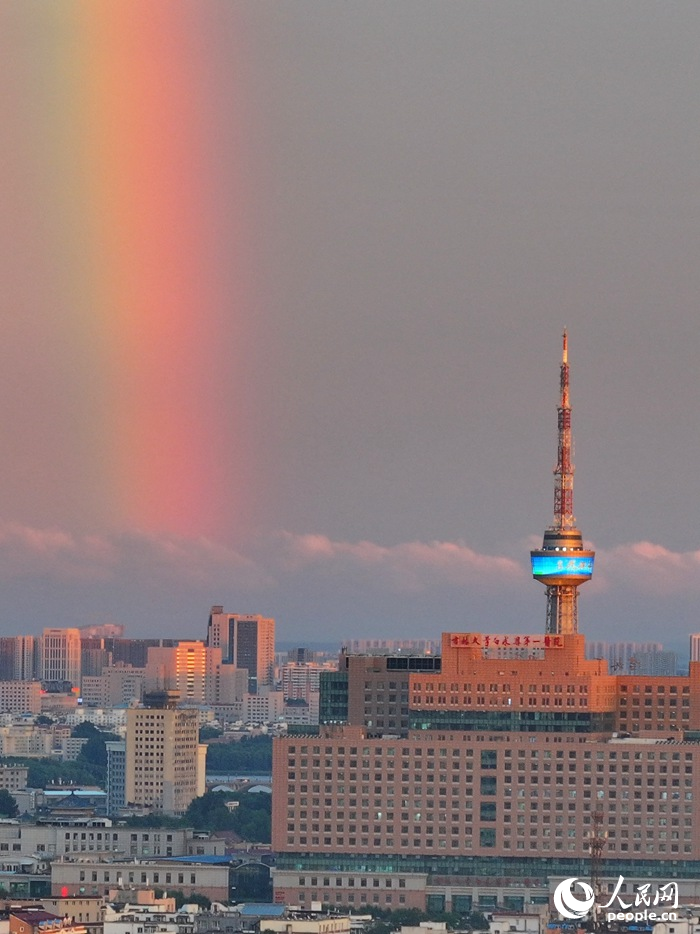 7月20日傍晚,長春市上空現大面積“火燒云”和雙彩虹景觀?;馃茖⑻炜杖境梢黄燃t,晚霞滿天,蔚為壯觀。