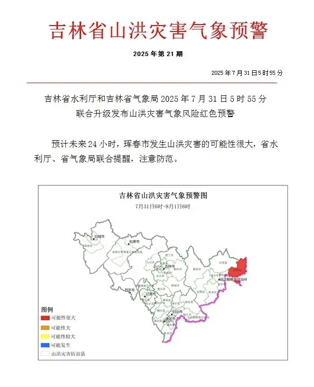 人民網長春7月31日電 (記者李洋) 7月31日5時55分,吉林省水利廳和吉林省氣象局聯合升級發布山洪災害氣象風險紅色預警:預計未來24小時,琿春市發生山洪災害的可能性很大。吉林省水利廳、吉林省氣象局聯合提醒,注意防范。