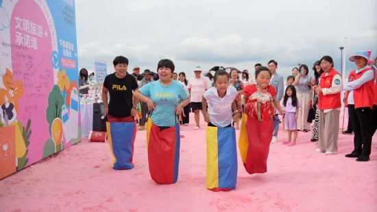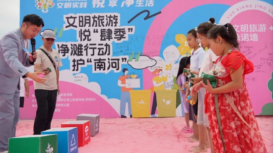 “文明旅行袋 躍動南河”游戲中,四名參與者套上特制的文明旅行袋,在沙灘上奮力跳躍,向著終點進發。他們的身影在陽光下充滿活力,引得周圍觀眾紛紛加油助威。一位參與游戲的市民笑著說:“這個游戲很有趣,在玩耍的過程中,也讓我更加深刻地記住了文明出游的理念,以后出游一定會帶走垃圾,做到無痕旅行。”