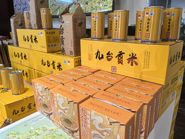 剛一踏進“九臺貢禮”文化餐廳,門前大廳擺放著精美的九臺特產(chǎn)讓人挪不開眼:九臺貢米、二十家子粉條、人參膏、九臺熱面、人參蜜片……再配上屋子內(nèi)美食的誘人香味,讓人忍不住流口水。