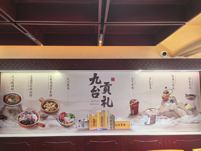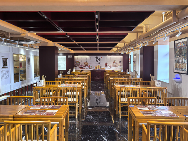 進門左側(cè)點單,右側(cè)一大片餐桌整潔擺放,供顧客堂食使用。在餐桌兩側(cè)的墻上,則展示著九臺區(qū)41項非物質(zhì)文化遺產(chǎn)。“這個區(qū)域包含傳統(tǒng)技藝、傳統(tǒng)美術(shù)等多個非遺板塊。我們希望通過搭建這樣一個集展示、交流與傳承于一體的綜合性平臺,讓游客在品嘗美食的同時,深入了解九臺的地域文化。”高杰說。
