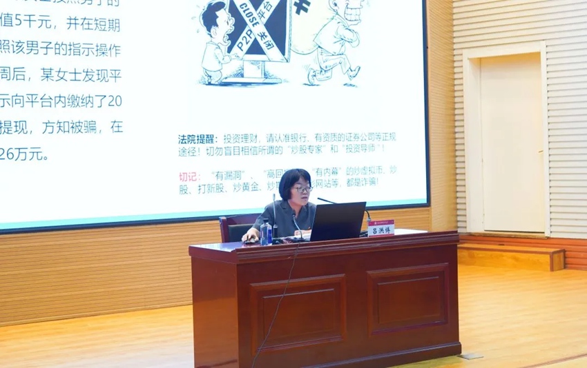 刑事審判庭員額法官呂洪博圍繞“防范電信網(wǎng)絡(luò)詐騙”這一主題,通過近年來的案件增速、涉案資金規(guī)模、相關(guān)部門攔截的詐騙電話數(shù)量等權(quán)威數(shù)據(jù),向在場(chǎng)師生生動(dòng)清晰地揭示了當(dāng)前電信網(wǎng)絡(luò)詐騙高發(fā)的嚴(yán)峻態(tài)勢(shì),提醒大家在日常生活中要保持警覺,不可松懈。