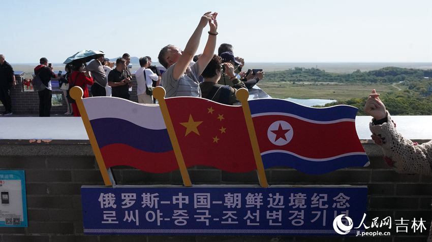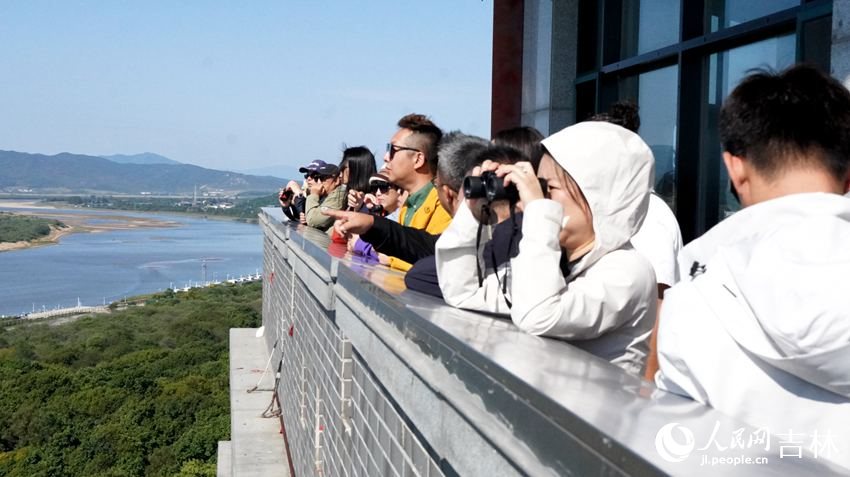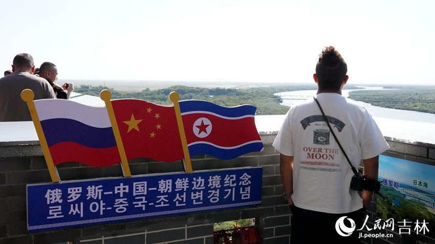 在防川景區,達人們登上龍虎閣遠眺,一覽中朝俄三國景色。濃密的樹林、緩緩流過的圖們江、更遠處湖泊沼澤的瀕海平原,以及那霧氣蒙蒙的日本海,與天際相連。