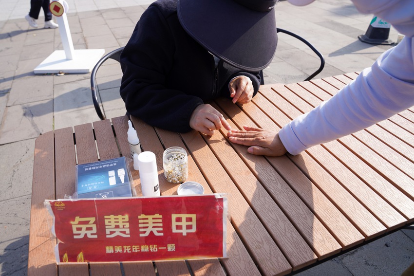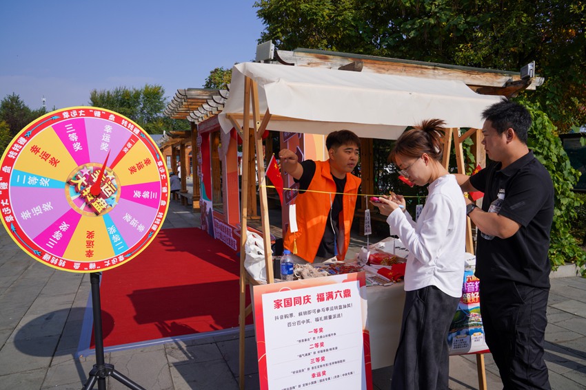 清祖文化園內,八旗帶刀侍衛巡園成為熱門打卡點。身著傳統服飾的“侍衛”邁著整齊步伐穿梭其間,與游客合影互動,讓大家沉浸式感受滿族歷史文化,仿佛“穿越”回古代。景區入口處互動體驗活動同樣人氣高漲,游客們通過答題領取金玉滿堂福蛋,手握寓意福壽雙全的福蛋喜笑顏開。免費發放的六鼎山禪茶香氣四溢,一杯暖茶驅散秋涼,也傳遞著美好祝愿。“食”來運“鉆”活動前,游客們爭相鑲上“美鉆”,期盼好運相伴。