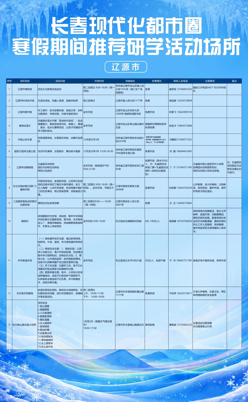 為豐富學生寒假生活,促進學生全面發展,長春市、吉林市、四平市、遼源市四地教育部門整合現代化都市圈優質資源,遴選并推薦135個寒假期間研學活動場所,為學生提供更多研學實踐的平臺和選擇,希望廣大學生積極參與、親身體驗,在實踐中感悟,在研學中成長。